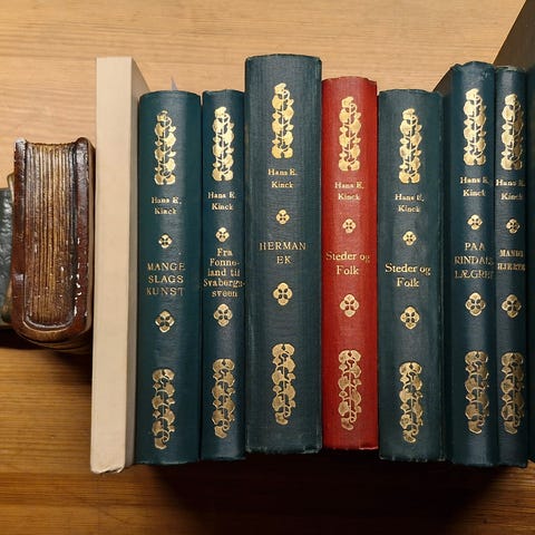 Bøkene er i fin stand, men smussomslaget har litt bruksspor