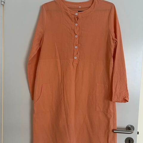 Enkel uformell kjole i fin varmgrå farge. 35% bomull, 65% polyester. Ikke brukt pga feil størrelse. Oppgis som størrelse M, men jeg vurderer den til størrelse 38. Slank modell.
