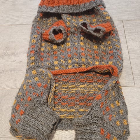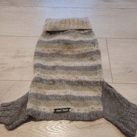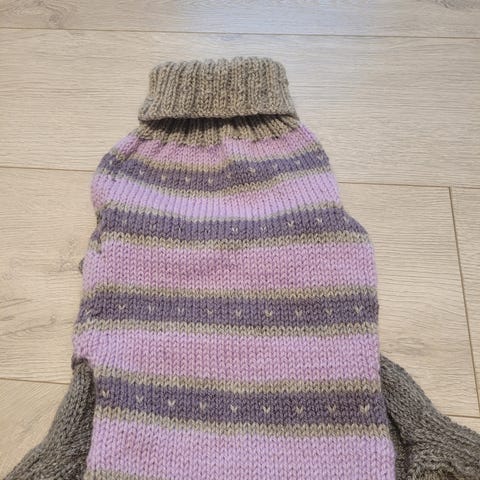 Hjemmestrikket dress til hund med rygglengde 39 cm. Dette er ikke ull, brukt på sommerhalvåret på kjølige dager av en nakenhund på ca 8 kg.
