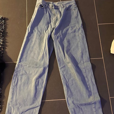 Midjen på bukse måler jeg til 43 cmx2, fra skritt og ned er 76 cm