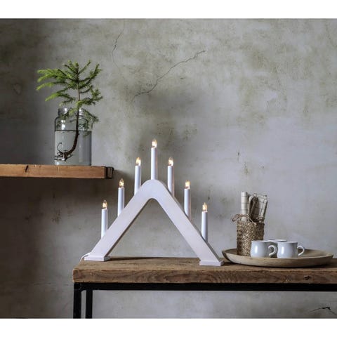 Hvitmalt treverk med 7 elektriske lys som gir et behagelig, dus lys. Vært brukt 1 jul – fremstår som svært pen.