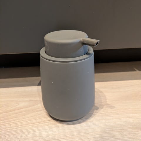 2 grå såpepumper selges samlet. Kjøpt på Kid.