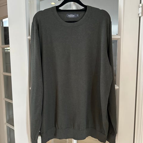 Olivengrønn. 80 % ull / 20 % polyamid. Litt lang passform