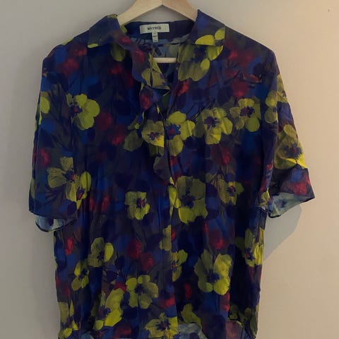 Vintage retro skjorte bluse strl 42 selges. Blå og grønngul. Skulderputer. Noe bruksmerker kan forekomme. Selges som den er. Se bilder.