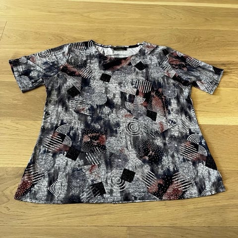 T-skjorte strl L selges. Lilla rosa farge. Blomstrete. Noe bruksmerker kan forekomme. Selges som det er. Se bilder.