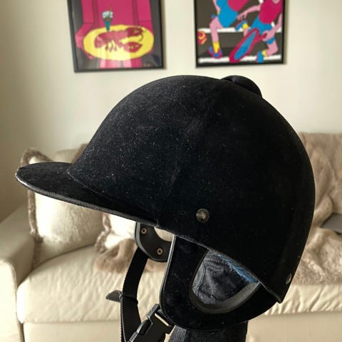 Ukjent Merke ridehjelm i sort farge. Hjelmen er laget for ridning og gir beskyttelse under aktivitet. Den har en komfortabel innside med rød polstring og justerbar stropp for sikker passform.