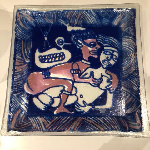 Nedsatt pris. Jan Widberg har hatt en stor produksjon av kunstneriske glassarbeider for Lindshammer. Dette glassfatet med fantasifullt ansikt mot blå bakgrunn er sterkt beslektet med flere andre av han motiver. Det er en mindre produksjonsfeil inne i fatet (se bilde). Fatet har en høyde på 5,5 cm og en diameter på 37,5 cm. Spesielt og flott fat.