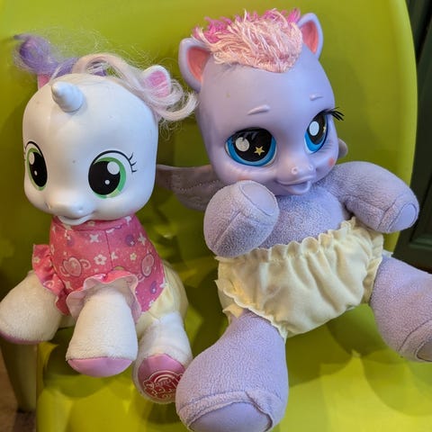 Selger to nydelige My Little Pony lignende bamser med hus. Kjøpt til mine to sønner, men de ble aldri brukt og selges derfor videre. Som nye, ikke brukt. Selges samlet for 300, hver for seg 200per stk.