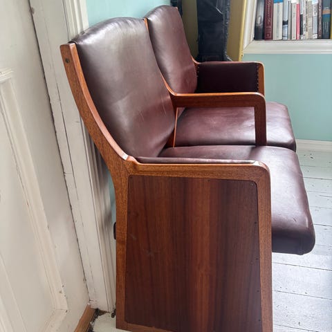 Sjarmerende og stilig kino benk i tre. Den er pusset og malt i brunt og trekkene er trukket om til mørk rød fløyel. Vi har også festet setene slik at de står fast nede (ikke vippes). Veldig dekorativ og fin, feks i en gang/entré. Bør festes i gulvet om man vil at den skal stå helt støtt, men vi har brukt den uten å gjøre det.