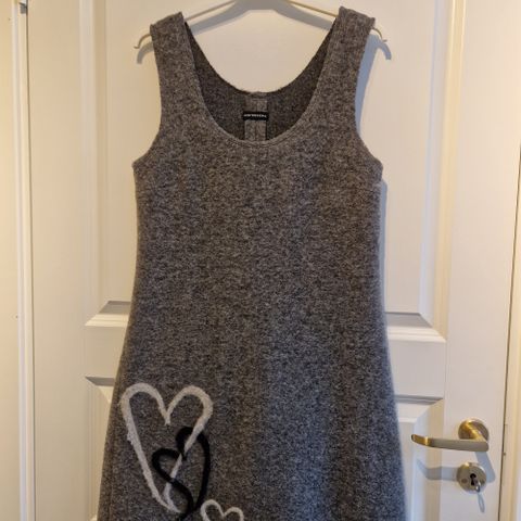 Nydelig rød tovet ull designkjole fra Leto.Helnorsk design og produksjon fra Leto på Lindås.Enkel,pen kjole uten armer.Str.S el.tilsvarende str.36/38.Hvitt brodert hjerte mot rød bunn.Sjelden kjole.Veldig fin høst,evt,julekjole