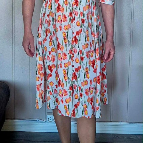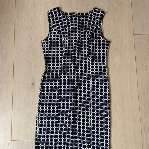 Nydelig, lett og lang kjole. Ermløs. Glidelås i siden. Lommer. Underkjole i underdelen.