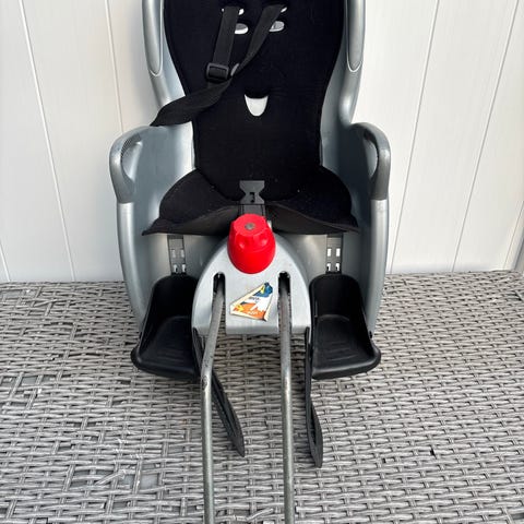 Hamax Siesta sykkelsete til salgs. Det har vært begrenset brukt, og ser derfor pent ut med lite synlig slitasje. Unntaket er det ene festet til fotreimen, som er knekt. Fungerer fortsatt fint i bruk. Mulig å kjøpe ekstra adapter for å enkelt kunne bytte setet mellom ulike sykler.