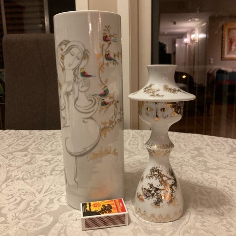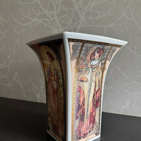 Lysestaker i porselen, 20 cm høye. Goebel Artis Orbis Mucha Seasons 1897. Selges sammen.
