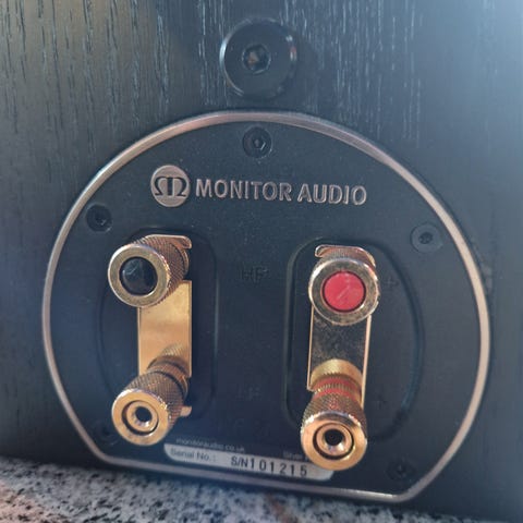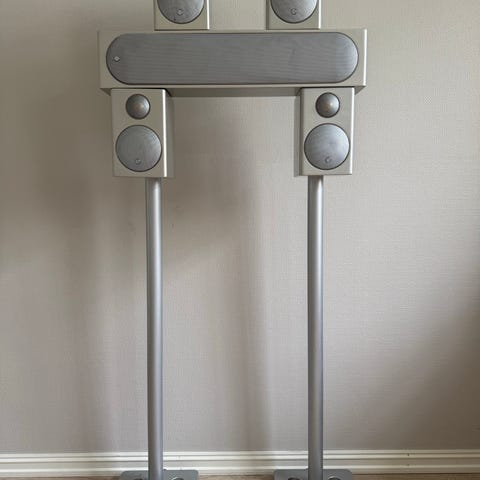 Meget pent brukt sett med 4 høyttalere Monitor audio radius 90 med to stativer, og én senterhøyttaler radius 225. i settet Høyttalerkabler av høy kvalitet.