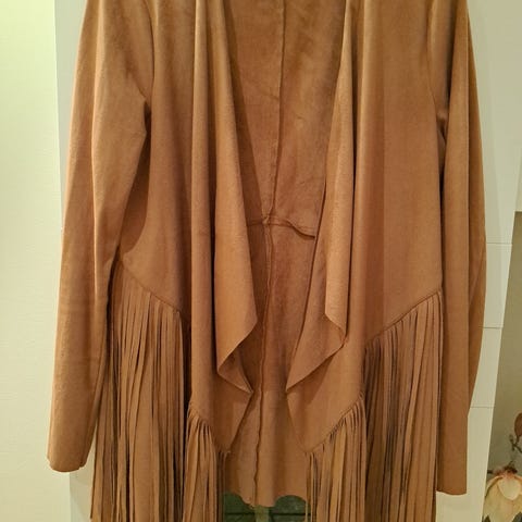 Stilig som sommerjakke eller cardigan i lys brun, suede følelse i stoffet. Lite brukt