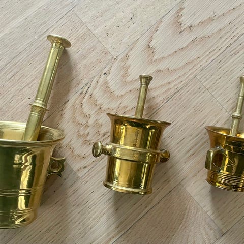 Selger to tunge mortere i messing med tilhørende støtere. Passer som dekorasjon/pynt/samlerobjekter eller til bruk.