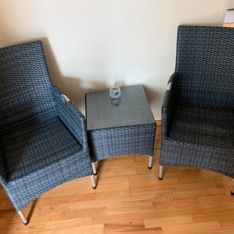 Lite brukt, stått inne stort sett hele tiden, et lite brennhål fra en glo på den ene puta, ellers som nye.