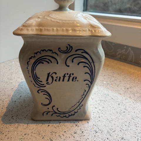 Stavangerflint krydderkrukker i porselen. Sett med veggkrukker for ulike tørrvarer, blant annet ris, havregryn, sukker og andre kjøkkenvarer. Krukkene er hvite med blå striper og blomstermotiv i rødt, gult og blått på forsiden, samt svart tekst som angir innhold. Hver krukke har lokk og fot som gjør at de kan stå stødig på benk eller hylle. Undersiden er merket Stavangerflint. Egner seg til oppbevaring av tørre matvarer eller som dekor på kjøkkenet.