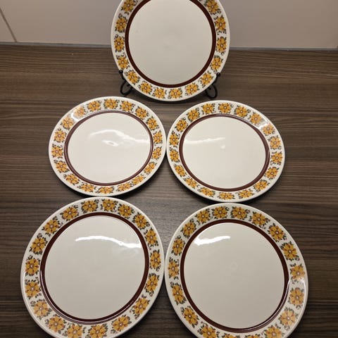 2 flotte, vintage skål fra Stavangerflint. Kremfarget med fruktdekor. Dype. Ø 17,3cm. Skadefri, bare litt slitasje på gullkanten, og den med pærer har lysere farger på fruktdekor.
