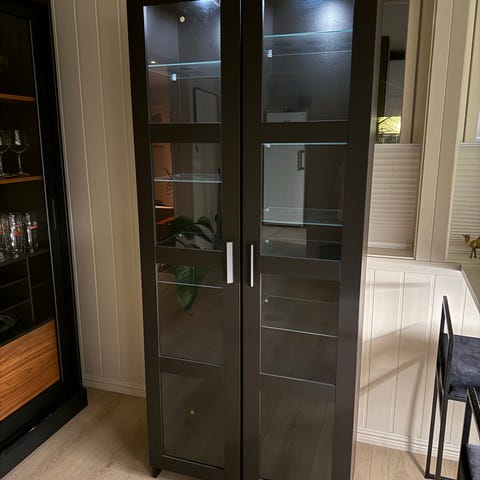 LIte brukt, ikkje synlig brukt vitrineskap i høg kvalitet. Lakkert eik finer, to glasdører med solide henglser, 4 glashyller. Pris nytt skap 25 000.- Må hentast i Askvoll, vi har ikkje plass til det i ny heim.