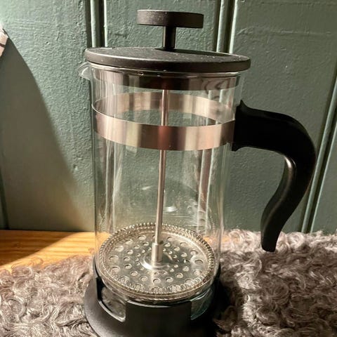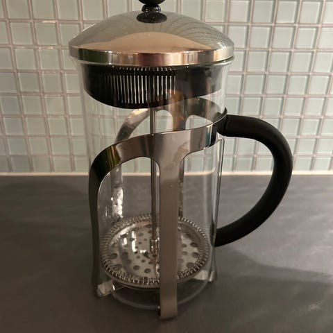 Klassisk presskanne for kaffe – enkel i bruk og perfekt til både hjemmekontor og helgefrokost. Glassbeholder med plastinnfatning og lokk, samt metallfilter. Brukt, men i fin stand og fullt funksjonell. Rommer ca. 0,75 liter (3–4 kopper).