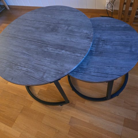 Selger sofabordsett med imitasjon av tre og sort understell. Settet består av et stort bord på Ø50cm og et mindre på Ø40 cm med henholdsvis høyde på 40 cm og 34 cm. Bordene er flotte både sammen og hver for seg.