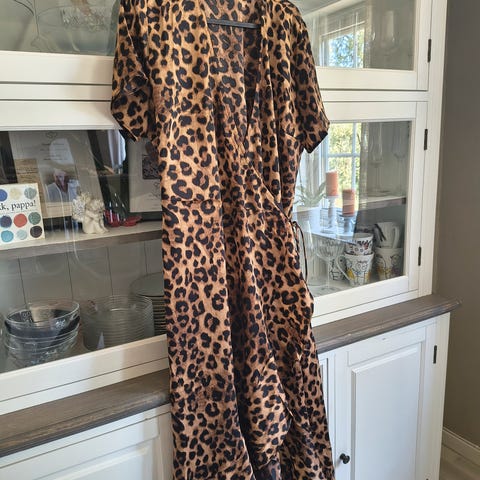 Nydelig leopardkjole fra Nolita str. L selges. Den er ubrukt/aldri vasket. Stretch i stoffet, glidelås i en side. Fin A-fasong. Lett og fint stoff, fin til sommer over badetøy. Fine detaljer rundt bryst og armer. Selges da den ikke sitter så fint på meg som jeg håpet😏