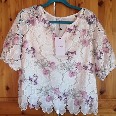 Søte, blomstrete bluser i myk viskose selges samlet. "Hippieermer", hvit bunnfarge og kniplinger over brystet og på overermene. Den ene har mest rosa blomster, den andre rosa + div høstfargede blomster.