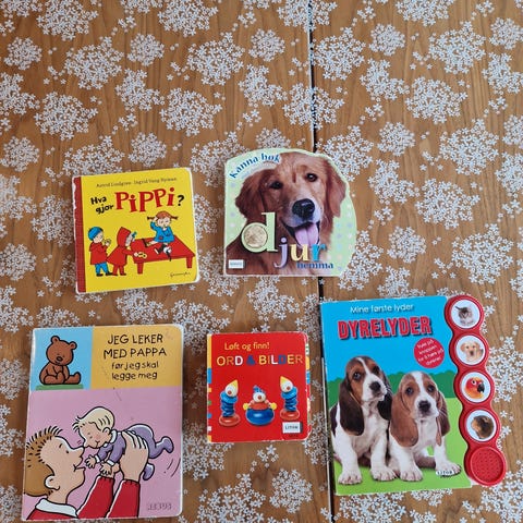 Pakke med 12 bøker til baby / småbarn fra 0-2 år. De fleste er relativt pent brukt, men det er bruksmerker på dem. Noen av bøkene er teipet litt sammen.