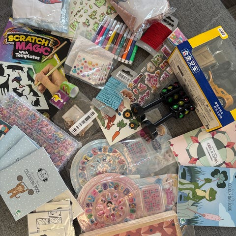 Pakke med småleker, godteri og aktiviteter for barn (innhold til MAGIC BOX)
