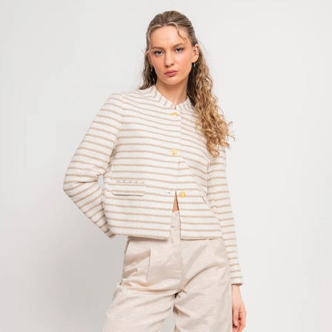 Mia blazer fra norske Ane Mone i en flott beigefarge. Blazeren har klassisk krage, lange ermer og lukkes med to knapper i foran. Har lommer i front, i kordfløyel materiale og normal passform, dog kanskje bittelitt stor i størrelsen.