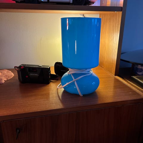 Den lyse blå lampen har ingen tydelige bruksmerker og den er i fin stand.
