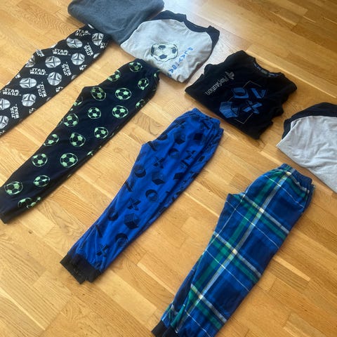 1 hel pyjamas i str 176/182, 1 pyjamas bukse str 176/182, 1 pyjamas t-skjorte str M, 3 pyjamas shortser str 176/182 selges for 30 kr.