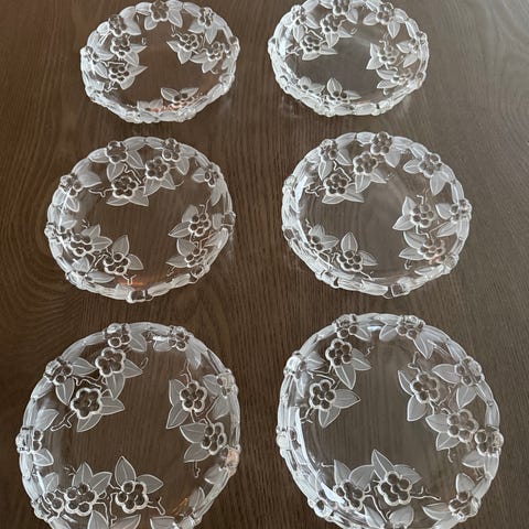 Tre stk serveringsfat / fruktfat i massiv glass med frostet 3D frukt dekor på undersiden.