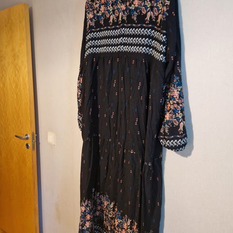 Selger en nydelig og komfortabel kjole fra BPC i dus grønn basefarge med søtt blomsterprint i lilla, hvitt og gult i str 48/50 (2XL-3XL). Kjolen har korte ermer med lett puff og rynkedetaljer, knapper i front og elastisk halsutringning som kan styles både som vanlig eller off-shoulder. Laget i et lett og behagelig stoff – perfekt for varme sommerdager, ferier eller en avslappet hverdagslook.