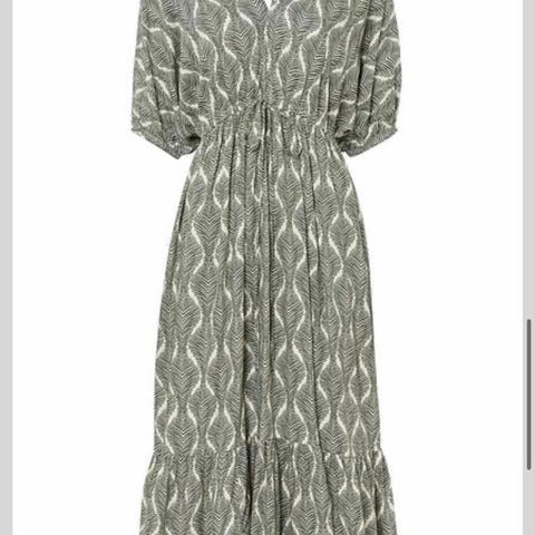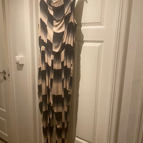 Selger en vakker maxikjole med mørk fra BPC collection. Kjolen har en ensfarget overdel og stripete skjørt i duse beige-, hvit- og marineblåtoner. Den dype V-halsen og det høye livet gir en veldig flatterende fasong, mens stoffet faller mykt og gir god bevegelse. Perfekt til sommerfester, cruise, ferieturer – eller bare når du vil føle deg ekstra fin. Ikke brukt, men prislappen har dessverre falt av.