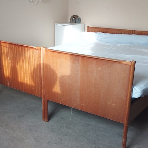To sengerammer i eik. Kan brukes som dobbeltseng eller som to enkle senger. Demontert og klar for henting.
