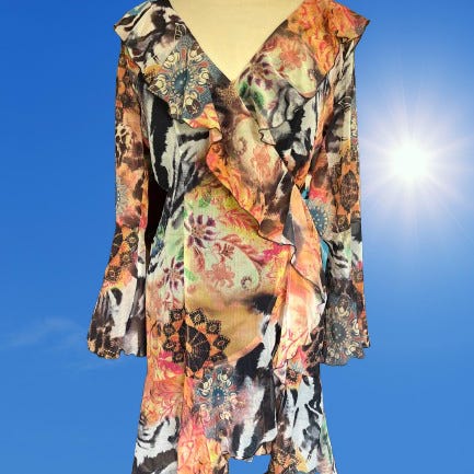 Selger en nydelig kjole fra MNG (MANGO) i svart chiffon med delikate blomster i duse farger. Kjolen har et flatterende snitt med v-utringning, markert midje med knytebelte og volanger nederst. Den er fôret og har lange, transparente ermer med strikk og volangdetaljer.