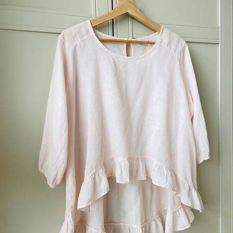 Pudderrosa kjole i 100% lin fra Katrin Uri, kun brukt én gang. Behagelig i fasongen. Kjolen kan pyntes opp og ned til mange anledninger.