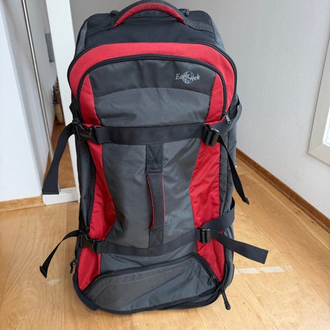 Asaklitt ryggsekk/trillebag/håndbagasje.