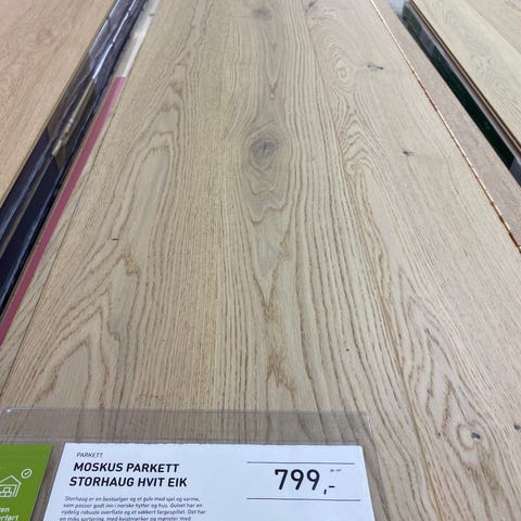 Flott eikeparkett i ubehandlet eik. Har tolv pakker (0.508m2 per pk.)