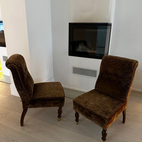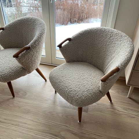 To ubrukte og helt strøkne lenestoler funnet på et uthuset innpakket i plast - kun den ene er pakket ut for bilde.. Amerikansk vintage design - uten at vi kjenner noe mer til det.