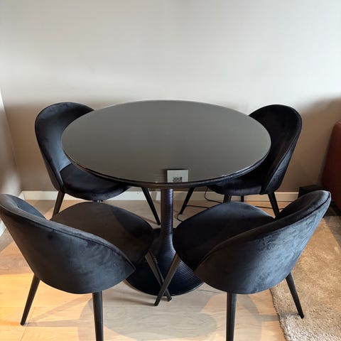 4 stk spisestoler som er så og si ubrukt. Veldig behagelige å sitte i. Lysegrå tekstil og sorte ben.