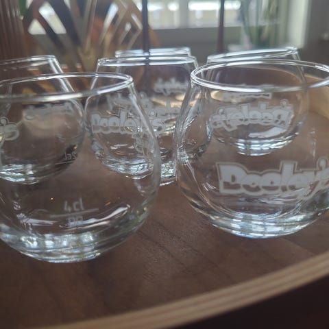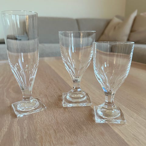 Glass merket H2O. D=7,5 cm og H=9,5 cm. Fem glass er merket H2O, To glass er umerket. Kr.30,- per stykk.