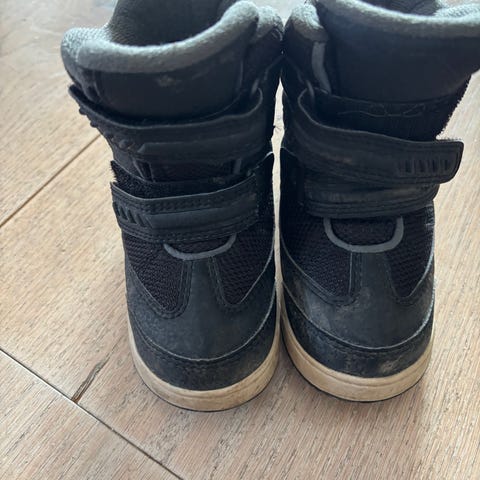 Skoene har vanntett Gore-Tex-membran, sklisikker yttersåle i gummi, og borrelåslukking som gjør det enkelt for små barn selv å ta skoene av/på. De er komfortable, stabile og støttende på foten. Skoene har fortsatt prislapp på, og ligger oppbevart i originalesken.