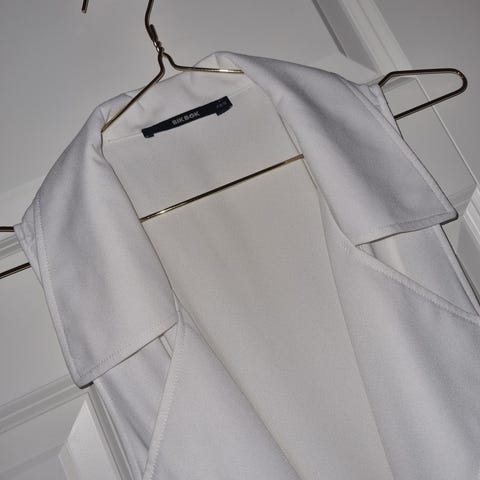 Korallfarget /ferskenfarget dressjakke str. 34, knapt brukt (H&M). Like fin til kjoler som til en tøff olabukse. Selges med tungt hjerte da den er blitt for liten til meg - knallfin farge til sommerbrun hud.