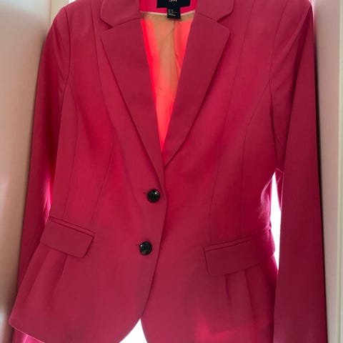 Korallfarget /ferskenfarget dressjakke str. 34, lite brukt (H&M). Like fin til kjoler som til en tøff olabukse. Knallfin farge til sommerbrun hud.