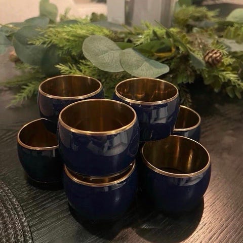 Som nye serviettringer i eske, 12 stykker i sølvfarge og blått glass til salgs