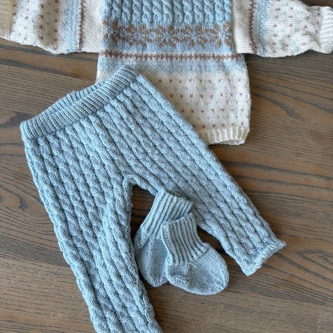 Nytt og ubrukt hjemmestrikket hentesett. Strikket i Dale babygarn. Str 0-3 mnd.