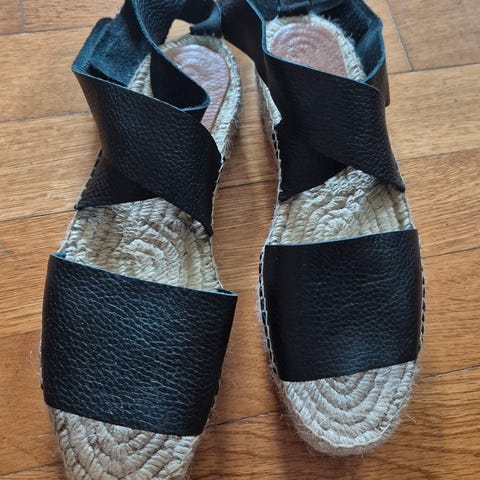 Sandalene har en beige og sort farge. God kombinasjon. Semsketskinn.
